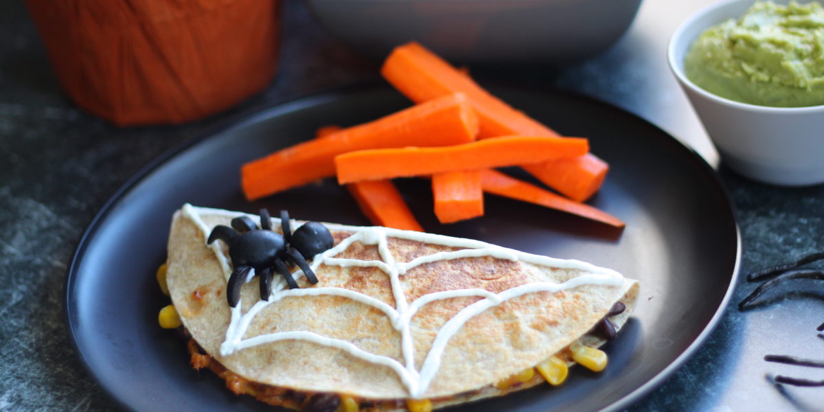 For an extra thrill, decorate the quesadillas with Greek yogurt spiderwebs and black olive spiders. No need for a fancy piping bag. Use a squeeze bottle, an old (clean) condiment bottle, or simply fill a zip-top bag and snip the corner to create your own piping bag. Your family will love them even if they aren’t Pinterest-perfect. To oven-bake the quesadillas, follow the directions found here.