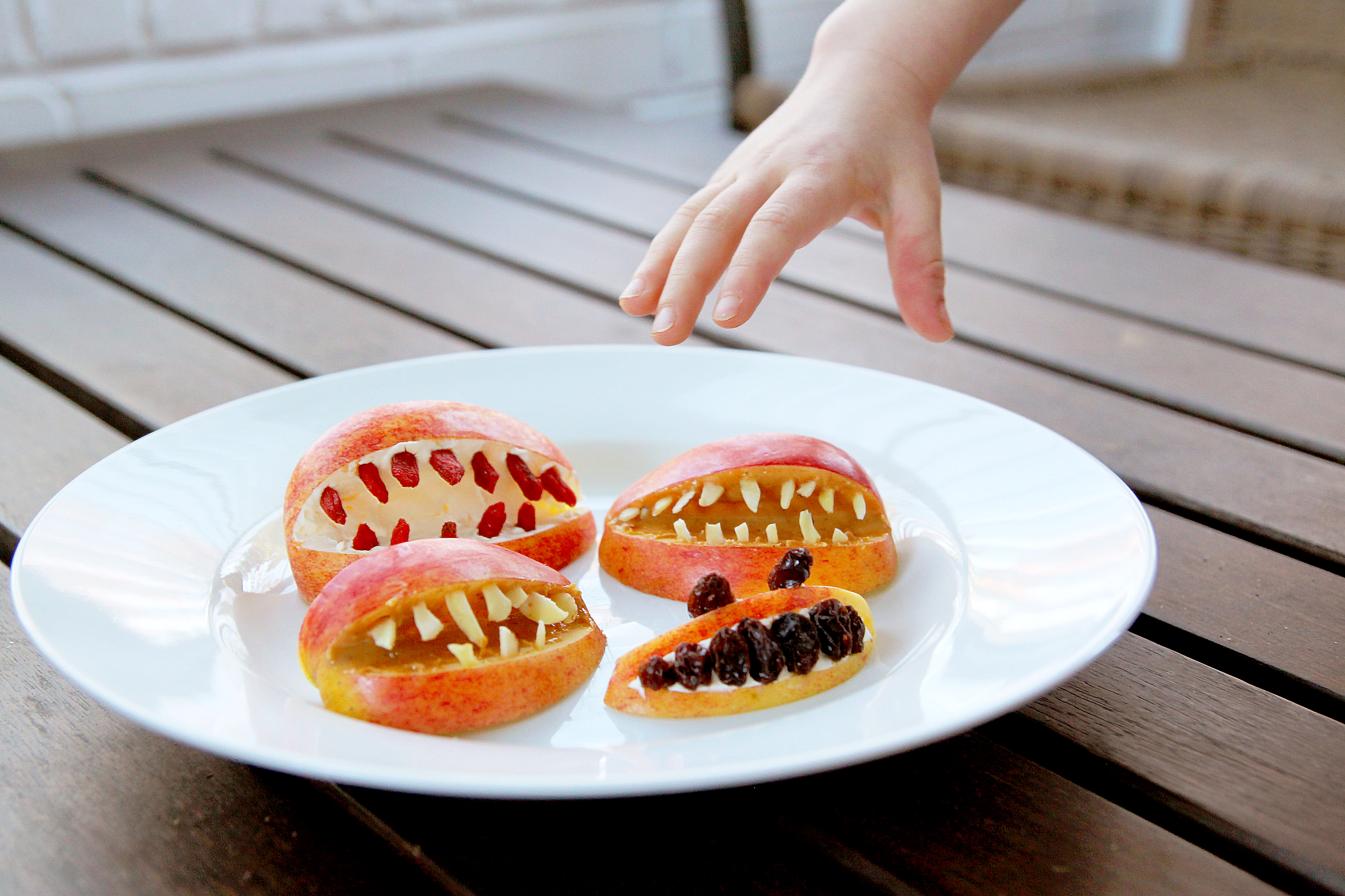 Apple wedges are used to create terrifying monster mouths. Cut a wedge and fill with the nut butter of your choice (or cream cheese, if allergies are a concern). Use slivered almonds, sunflower seeds, raisins or mini marshmallows to create jagged teeth. If you are avoiding nuts, try using goji berries, dried bananas or cranberries for teeth. You can even use a strawberry slice for the tongue!