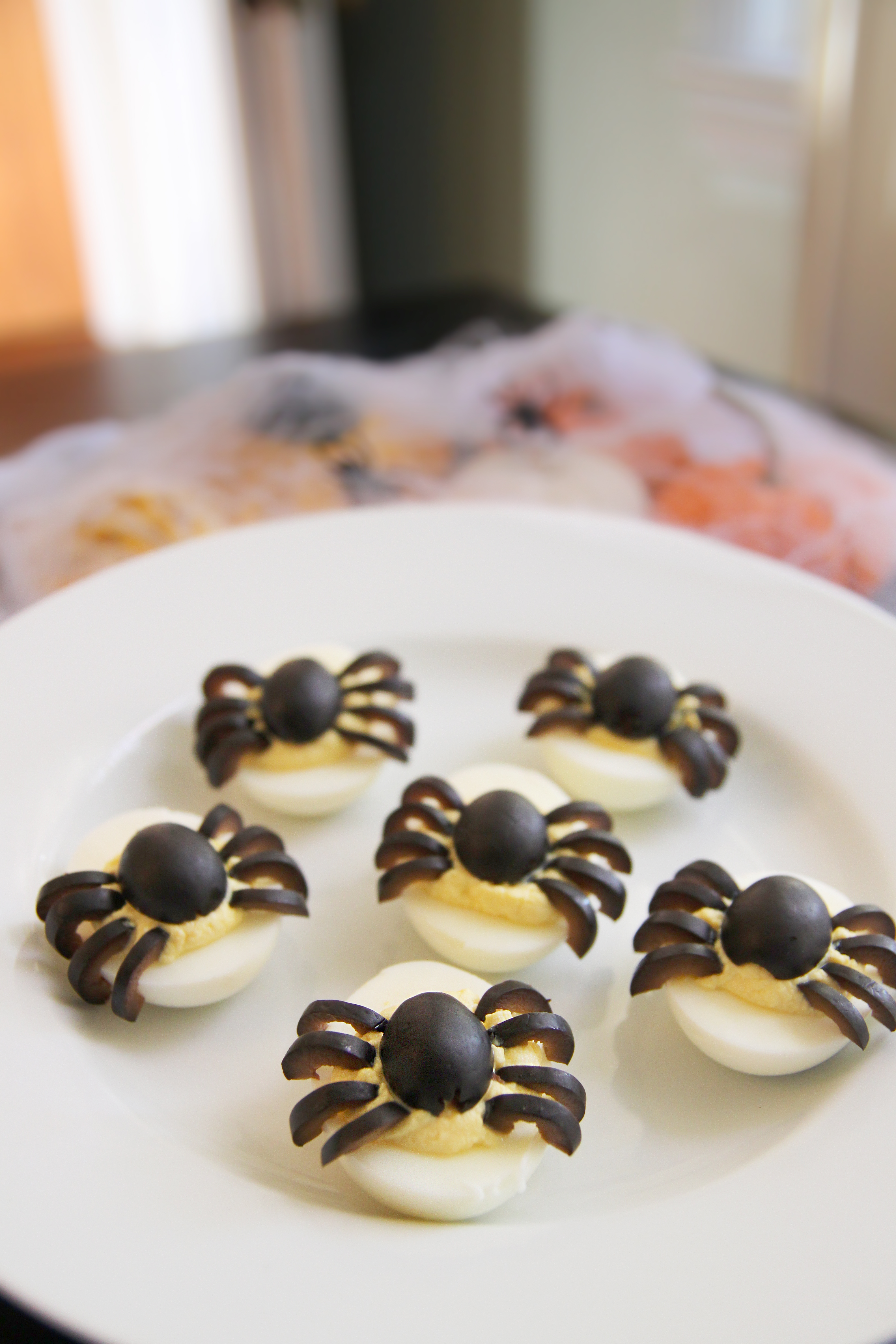 Top your favorite deviled egg recipe with a black olive spider. Drain and slice canned olives in two. Use one-half for each body. Slice the extra halves into legs.