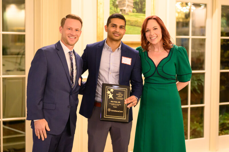 Timothy Kegelman, M.D., Ph.D., a radiation oncologist at Delaware Radiation Oncology, has helped institute notable changes in the department since his arrival in 2022. He has been integral in the adoption of new technology, including an artificial-intelligence genomic assessment tool that determines whether prostate cancer patients can safely choose watchful waiting over treatment. “Dr. Kegelman has integrated into our multidisciplinary program flawlessly,” said Adam Raben, M.D., Radiation Oncology chair. “He has taken on a leadership role in our quality assurance and event review committee program to improve our quality of care and identify opportunities to improve our program.” Sunjay Shah, M.D., of Radiation Oncology, presented the award.